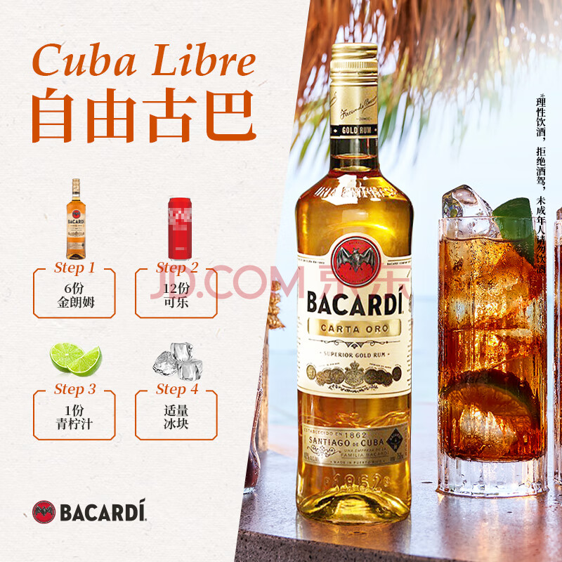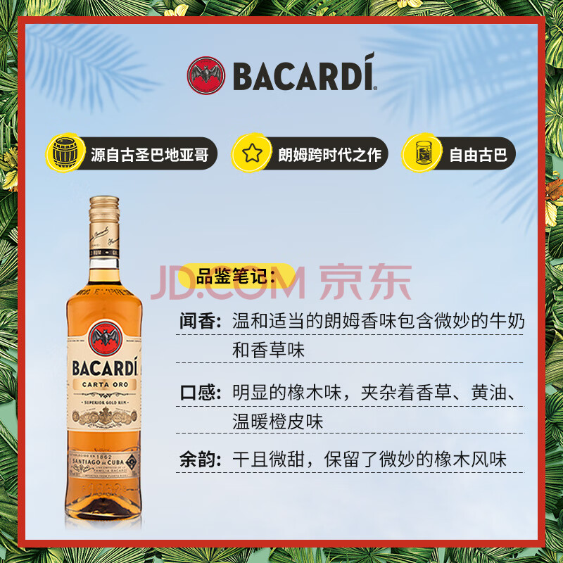 商品相册:百加得(Bacardi)金朗姆酒 洋酒 莫吉托 基酒调酒 750ml 调酒必备 送礼第1张/共7