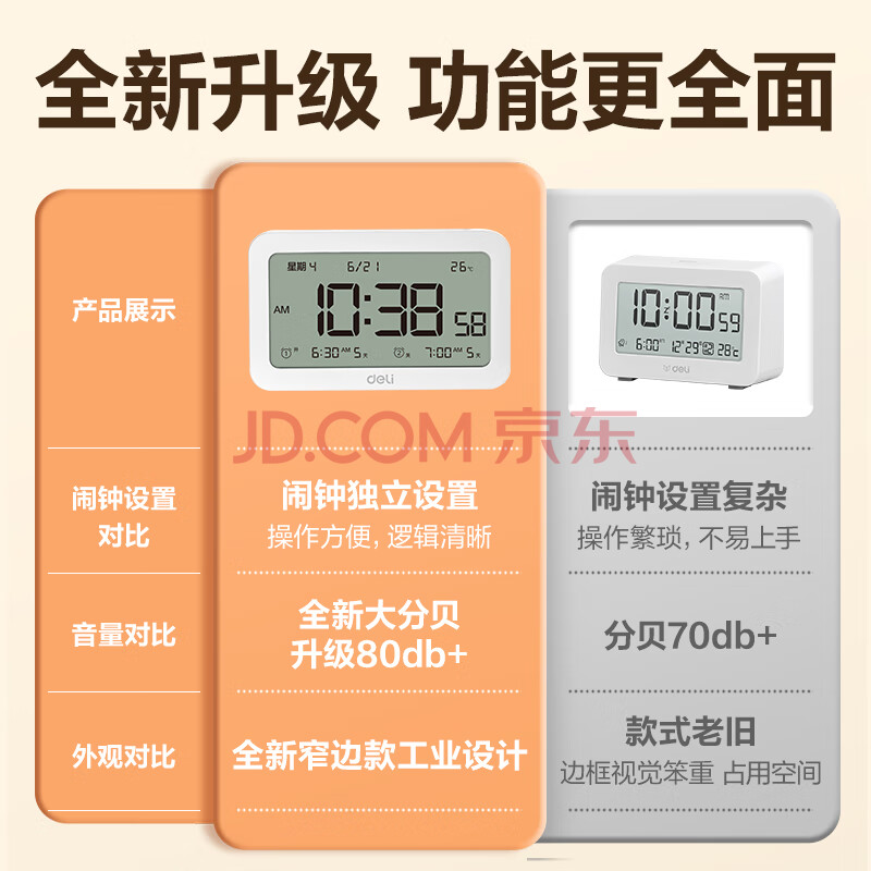 商品相册:得力(deli)电子计时闹钟多功能温湿度日期宿舍背光电子钟时间管理学生专用起床神器 白色 8839开学季新年礼物第