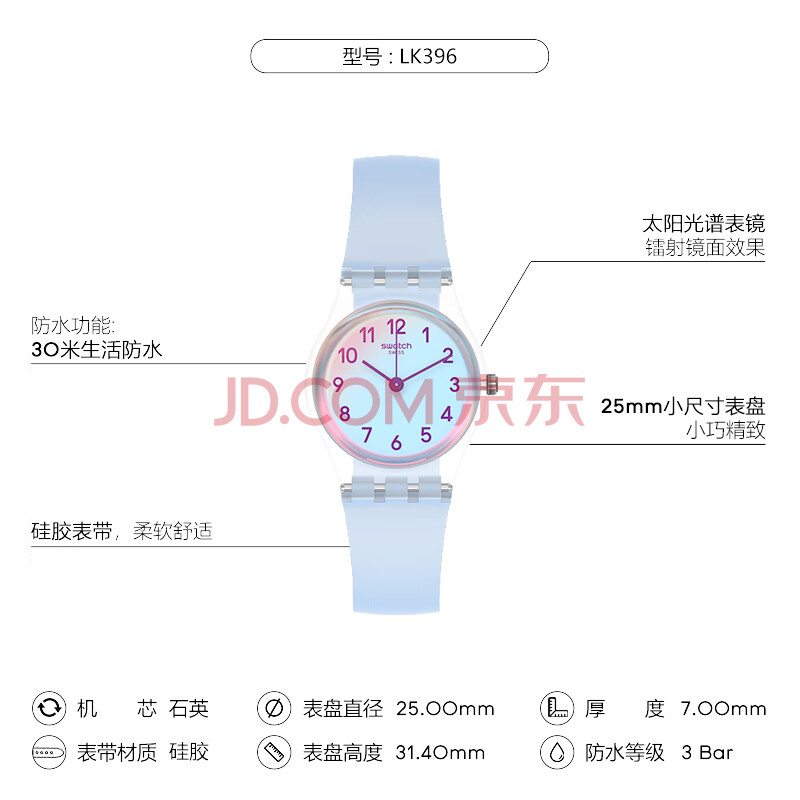 商品相册:斯沃琪(Swatch)瑞士手表 纯净天蓝 小巧生日礼物潮流石英腕表初高中考试表 LK396第