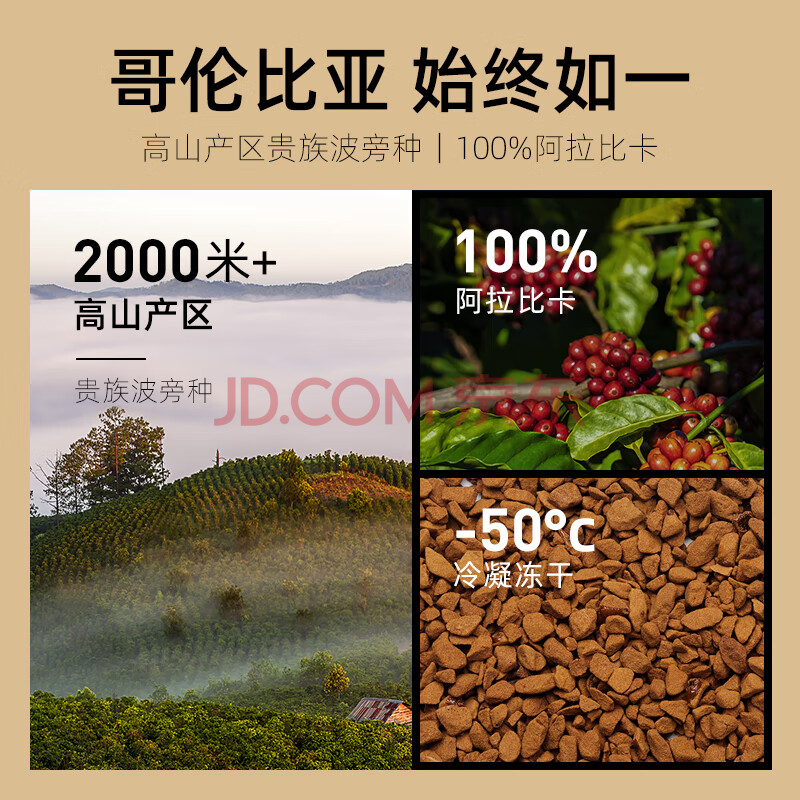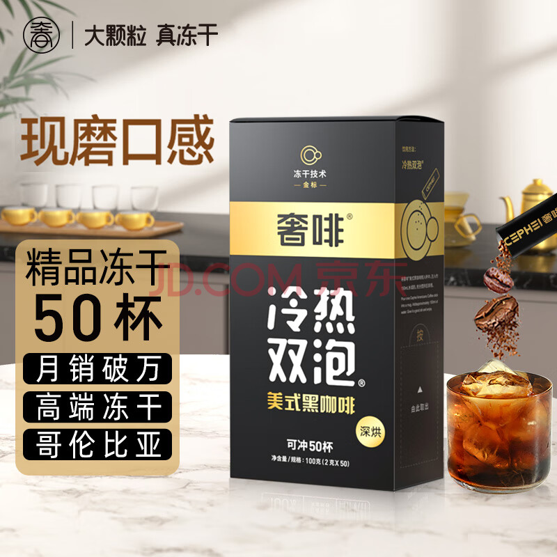 商品相册:奢啡金标现磨口感哥伦比亚精品冻干黑咖啡冷热双泡无糖0添加2g*50杯第