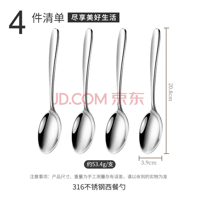 商品相册:广意316L不锈钢勺子套装 主餐勺西餐勺调羹汤勺加大成人款4件套GY7693第