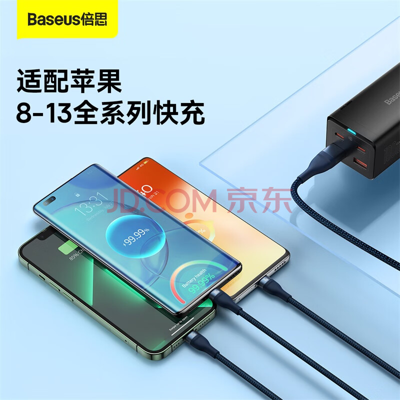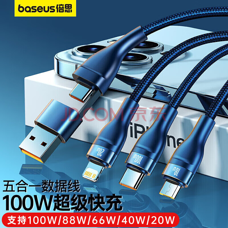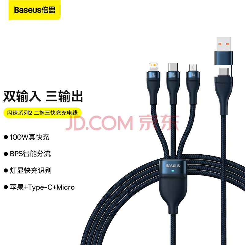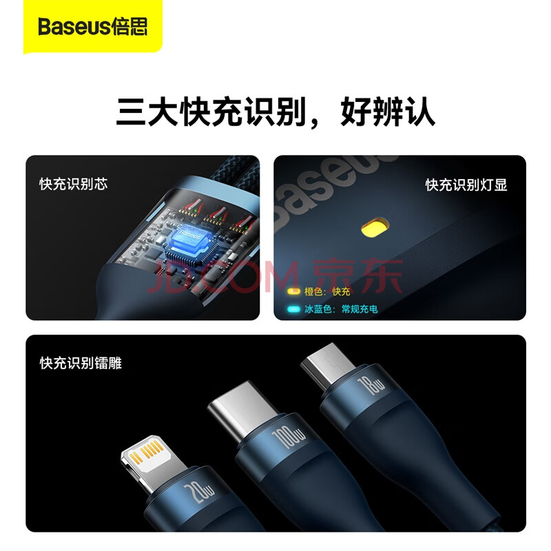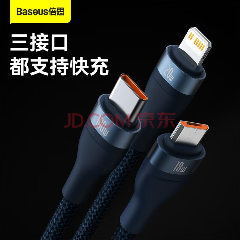 商品相册:倍思充电线三合一快充线PD充电线适用Type-c华为mate60pro苹果17/16/15/14promax手机电脑充电器线 蓝第
