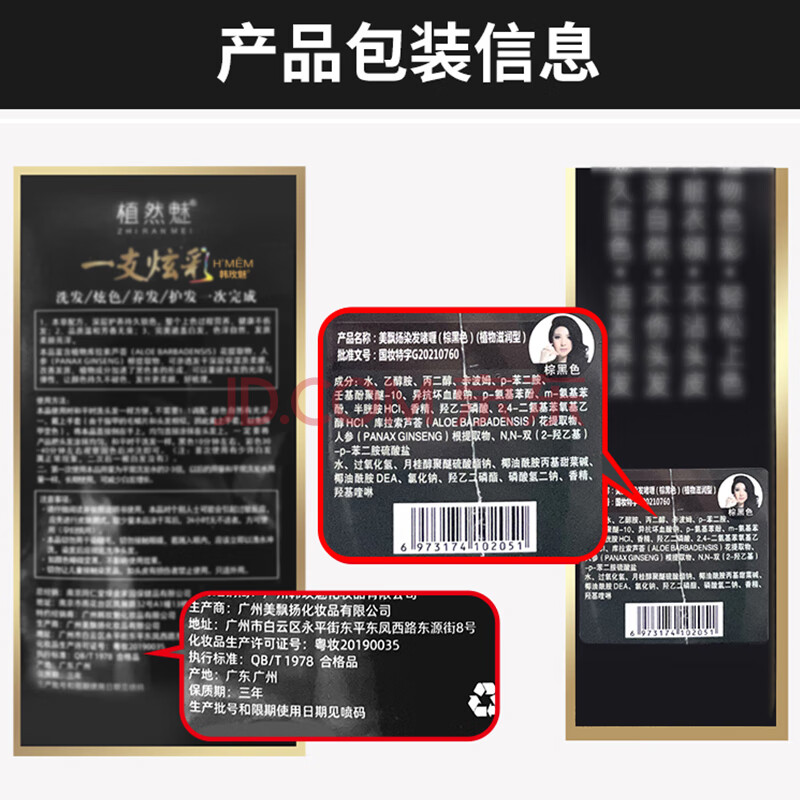 商品相册:韩玫魅南京同仁堂染发剂膏2瓶植物盖白发不沾头皮泡泡染纯棕黑色第