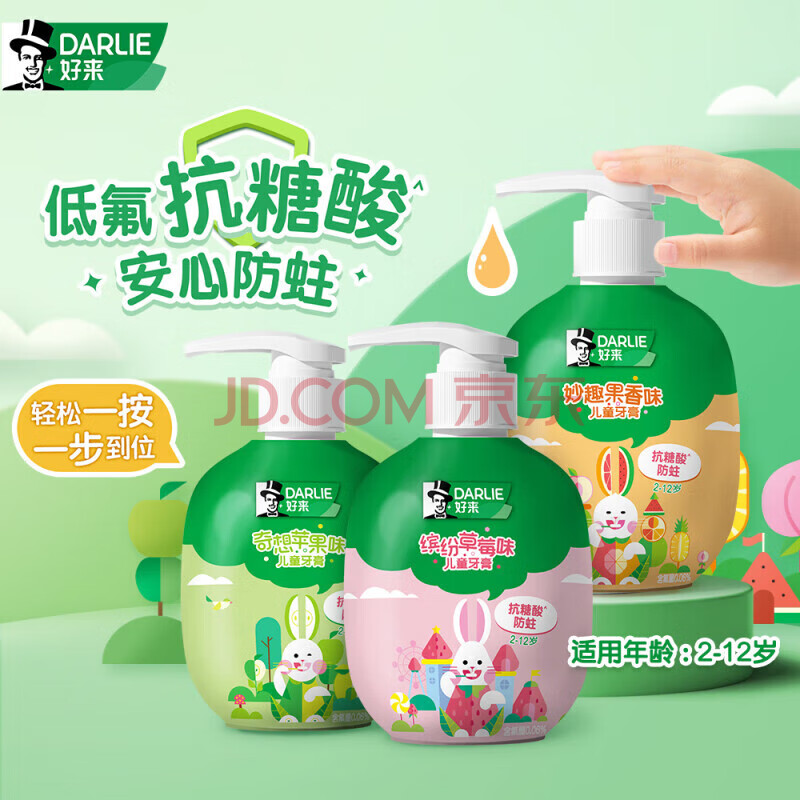商品相册:DARLIE好来(原黑人)按压式儿童牙膏2-3-6-12岁苹果味120g抗糖酸防蛀含氟第