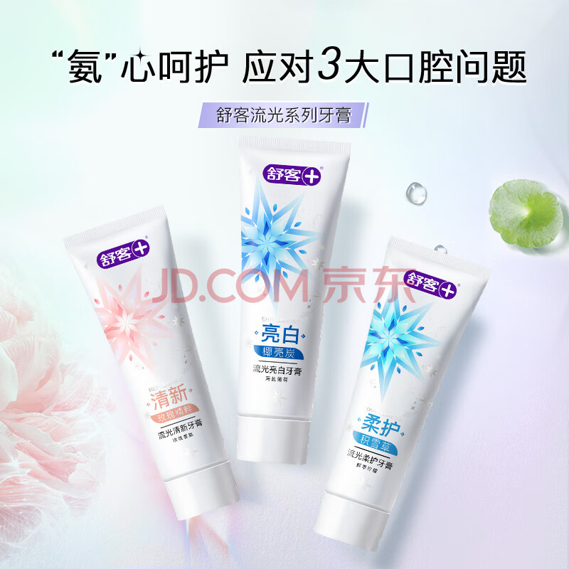 商品相册:舒客氨基酸流光护龈牙膏美白清新去渍亮白3支360g新旧随机3口味随机发第