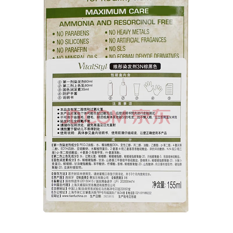 商品相册:维彤VitalStyl进口染发膏2N自然黑色155ml*2盒天然有机植萃健康盖白发第1张/共9