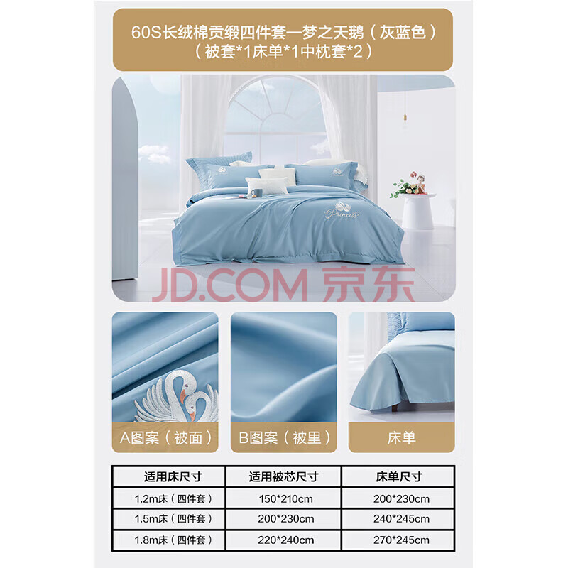 商品相册:水星家纺四件套床上60支长绒棉纯棉100%全棉丝滑床单被套学生宿舍单人1.2m床天鹅家居馆第