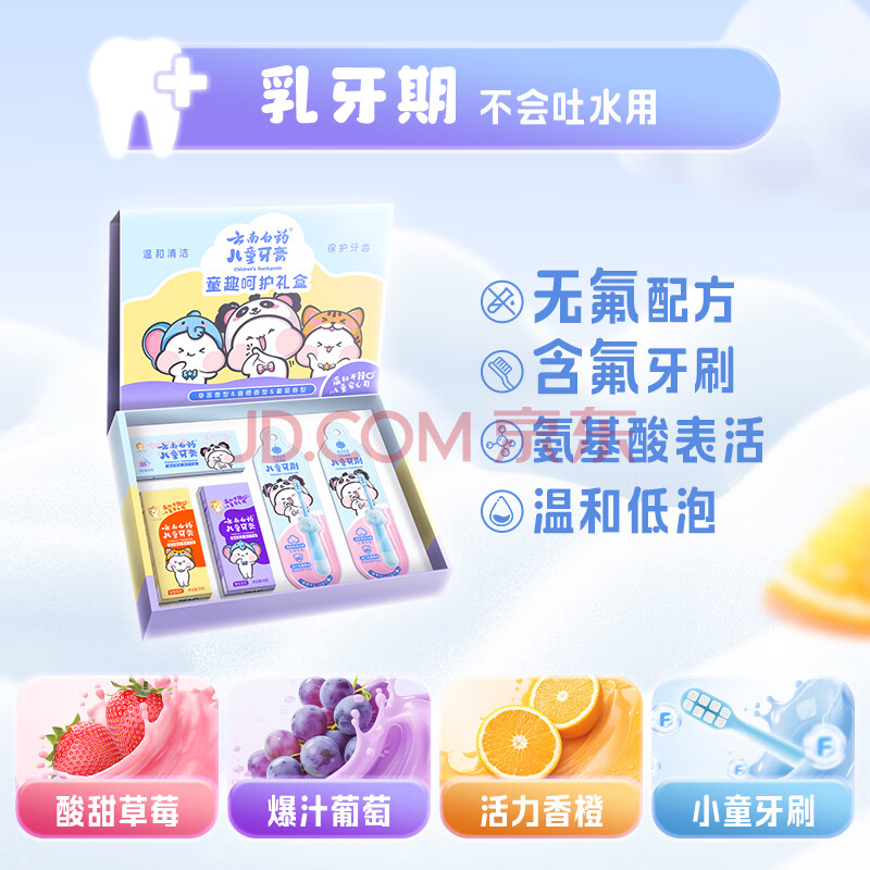商品相册:云南白药牙膏儿童3-6岁无氟益生菌洁齿清新果味不辣口牙膏牙刷宝宝礼盒装第