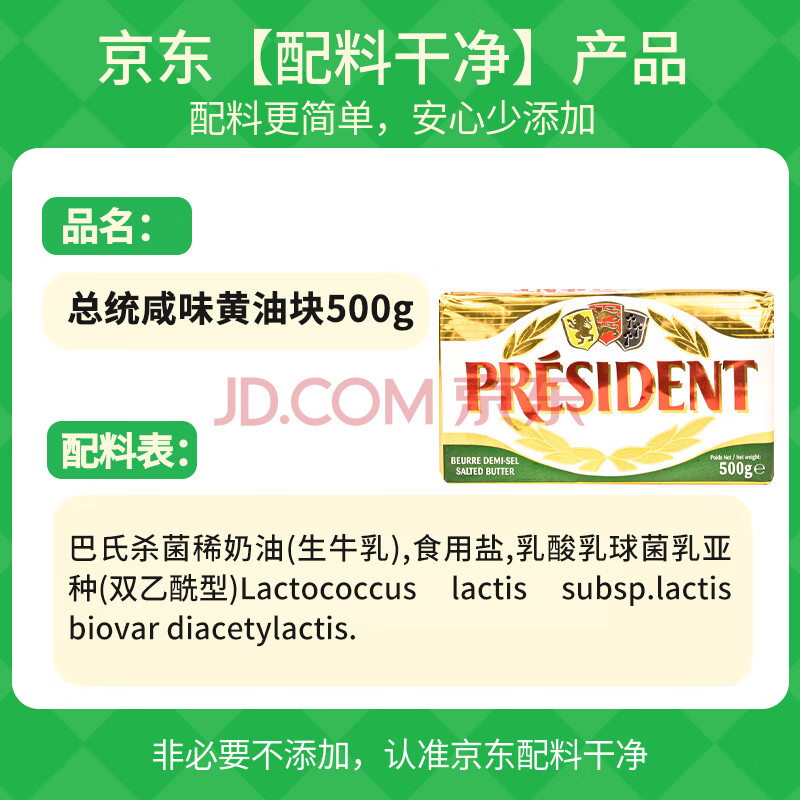 商品相册:总统(President)法国进口发酵型动物咸味黄油块 500g 一块 早餐 面包 烘焙原料第