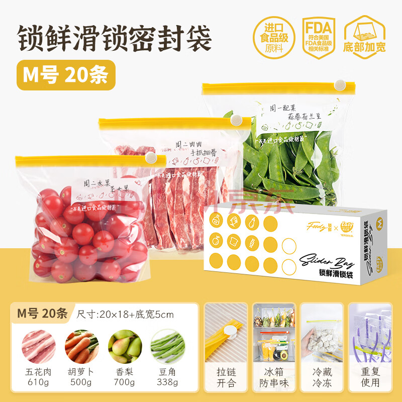 商品相册:易优家 拉链式密封袋食品级保鲜袋 家用冷藏冷冻收纳袋密实袋 中号20只第
