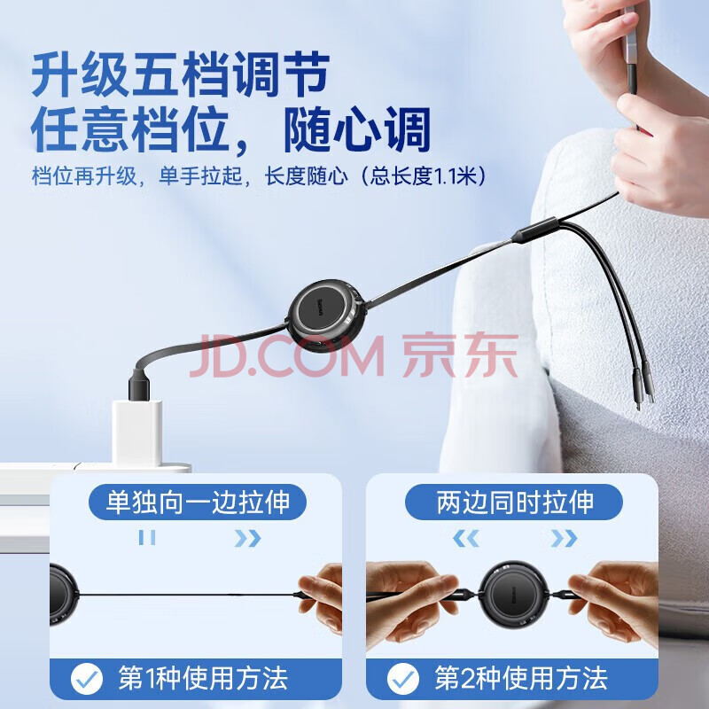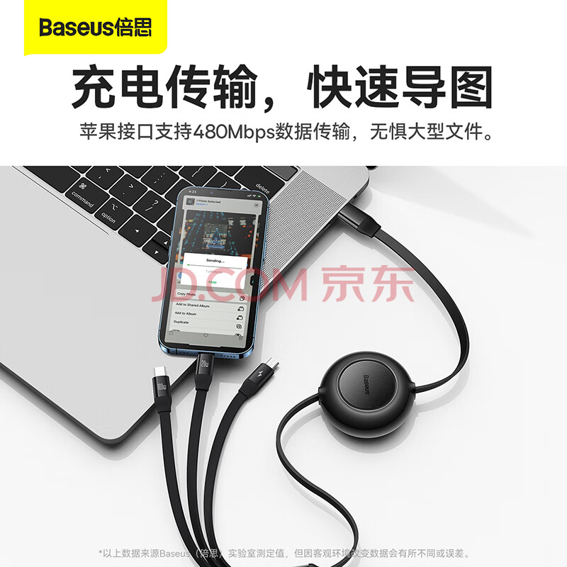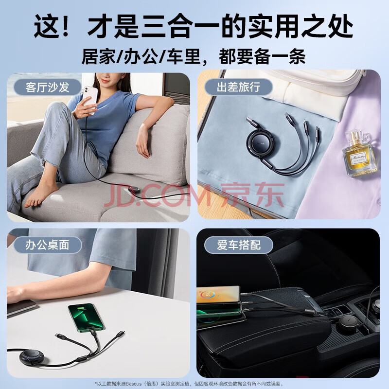 商品相册:倍思Type-C数据线三合一伸缩线PD100W5A快充一拖三适用苹果17/16/15/14小米华为mate70手机平板车载 黑第