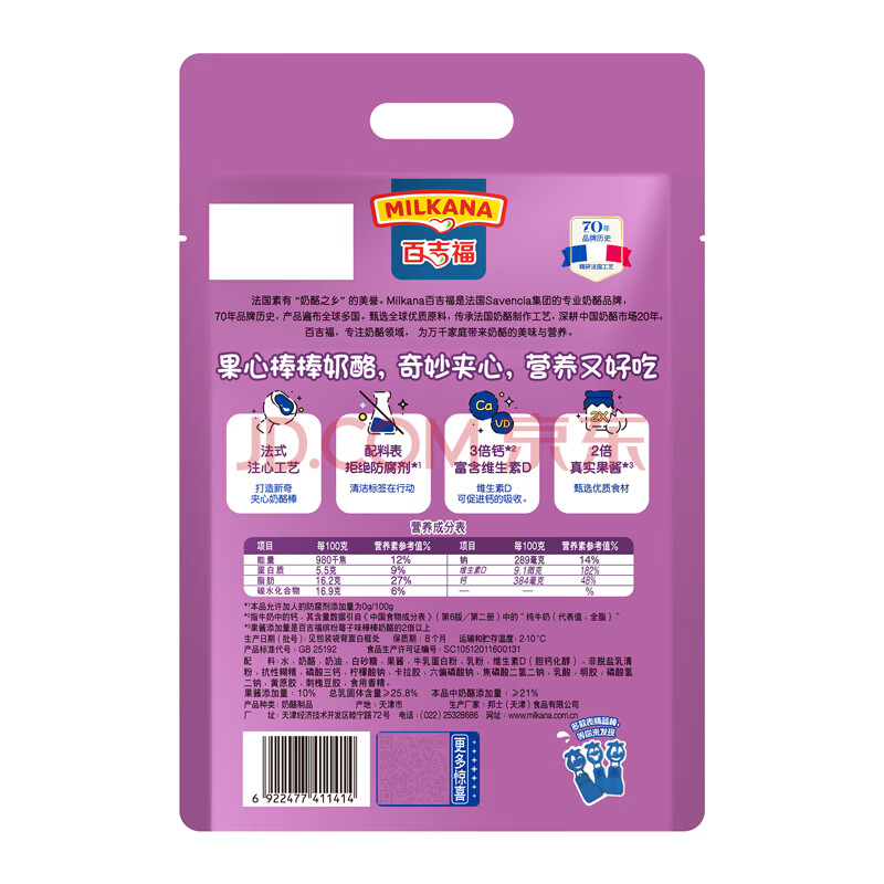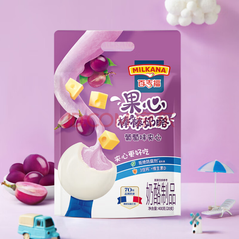 商品相册:百吉福(MILKANA)全新上市棒棒奶酪儿童奶酪棒 果心葡萄夹心味 400g/袋第