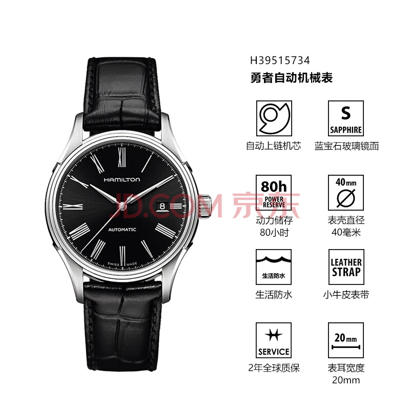 商品相册:汉米尔顿(Hamilton)汉密尔顿手表男士机械表 经典勇者40黑盘皮带简约商务表男士礼物第