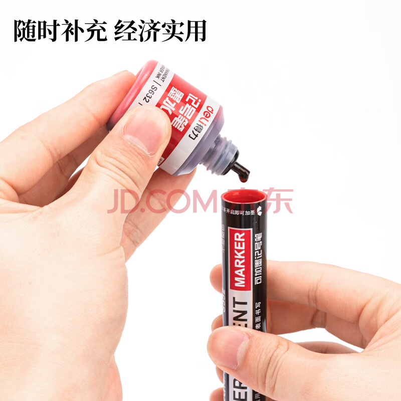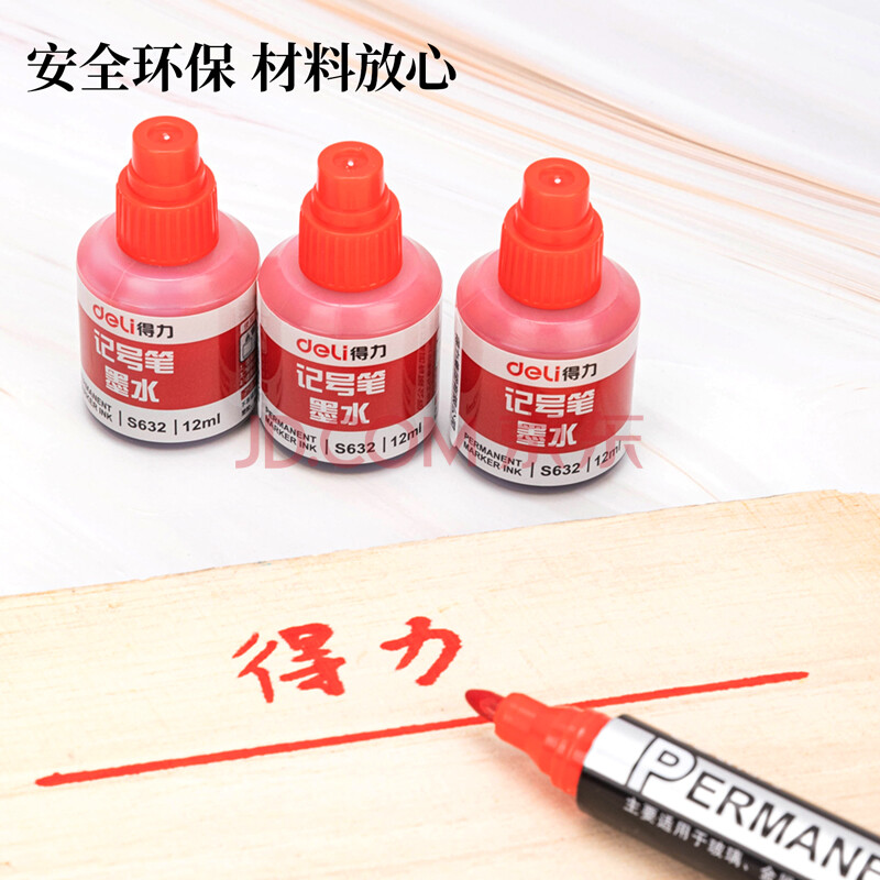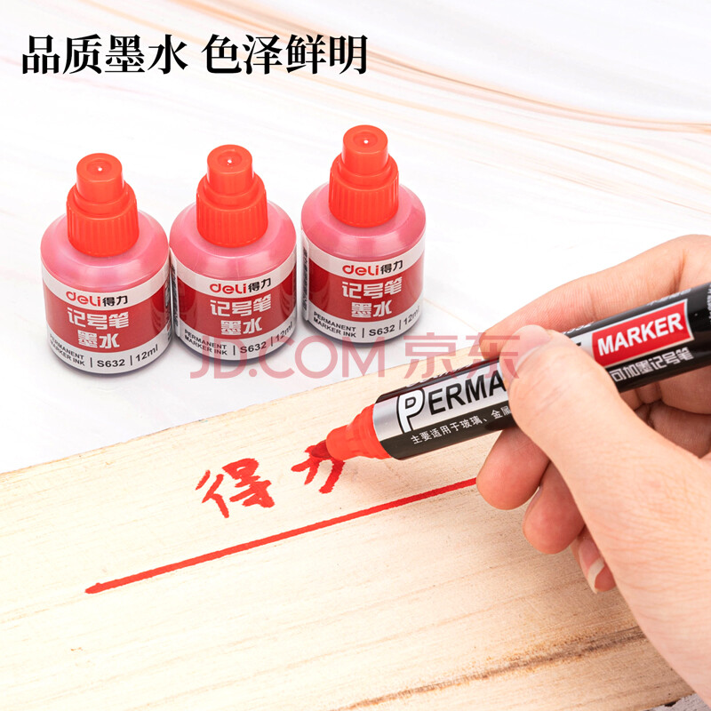 商品相册:得力(deli)记号笔墨水S632红色单头大头油性笔不可擦墨水勾线笔添加水可加墨标记笔墨水12ml单瓶装第
