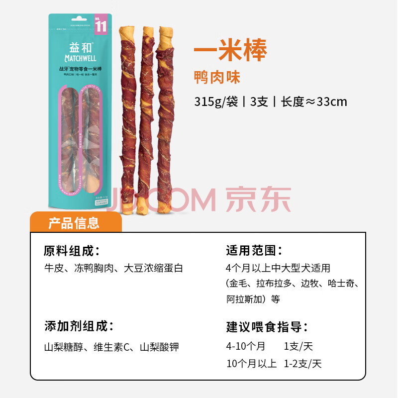 商品相册:益和狗零食磨牙棒缠鸭牛肉干宠物洁齿中大犬金毛哈士奇鸭肉一米棒315g第
