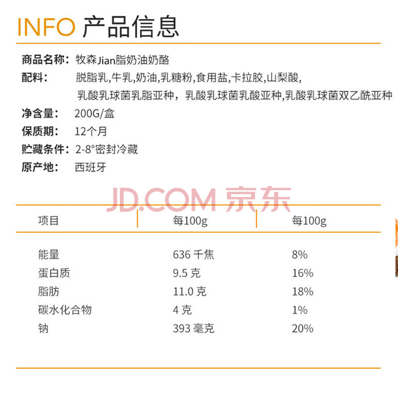 商品相册:牧森(SHPSON)西班牙进口 减脂奶油奶酪200g/盒 营养早餐 蛋糕面包 烘焙原料第