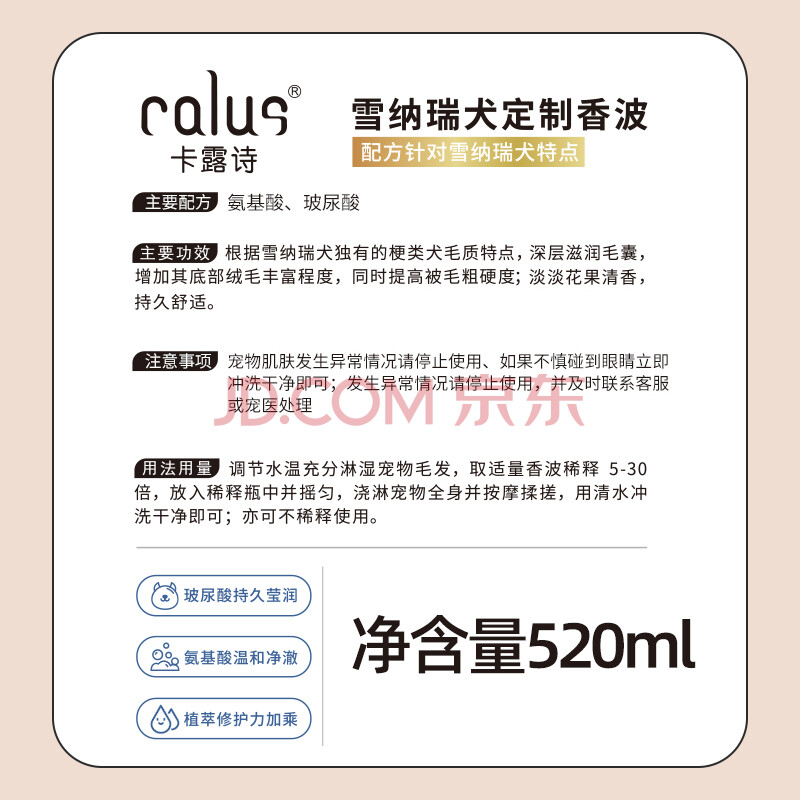 商品相册:卡露诗(calus)宠物狗狗沐浴露成幼犬通用除臭洗澡液香波雪纳瑞犬专用定制520ml第