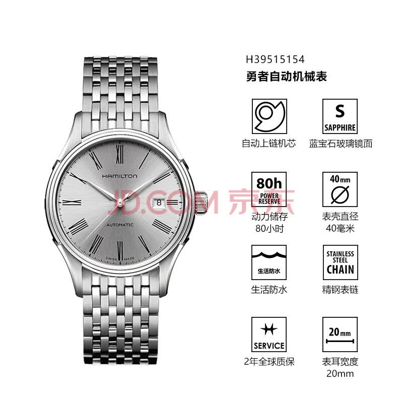 商品相册:汉米尔顿(Hamilton)汉密尔顿手表男士机械表 经典勇者40银盘钢带简约商务表第