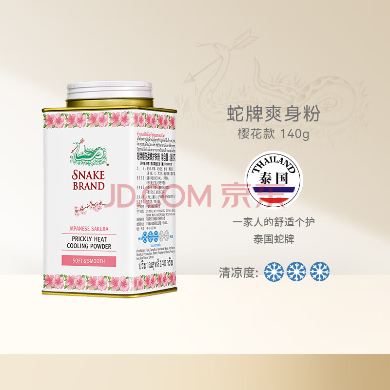 商品相册:蛇牌(SNAKE BRAND)樱花柔嫩护肤粉140g 泰国蛇牌爽身粉 蛇粉 痱子粉 泰国原装进口第