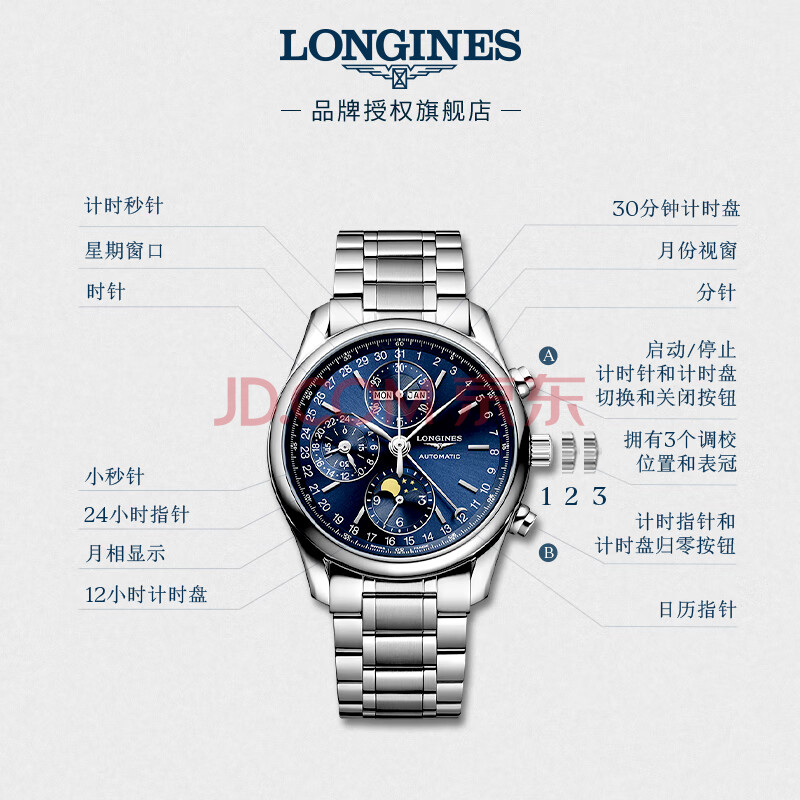 商品相册:浪琴(LONGINES)瑞士手表 名匠系列计时码表 月相男士钢带机械表 L26734926第