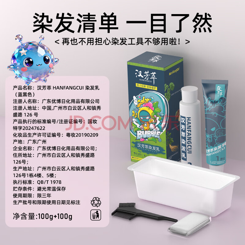 商品相册:汉芳萃(HANFANGCUI)染发膏天然植物无刺激盖白染发剂男女士专用非泡泡染头膏-蓝黑色第