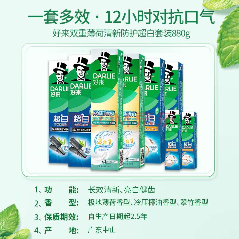 商品相册:好来(原黑人)热销榜双重薄荷2合1超白去烟渍去口气美白牙膏880g第