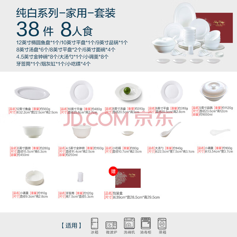 商品相册:斯凯绨(Sky Top)碗盘碟陶瓷餐具套装骨瓷纯白8人份北欧风家用乔迁礼盒包装38头第