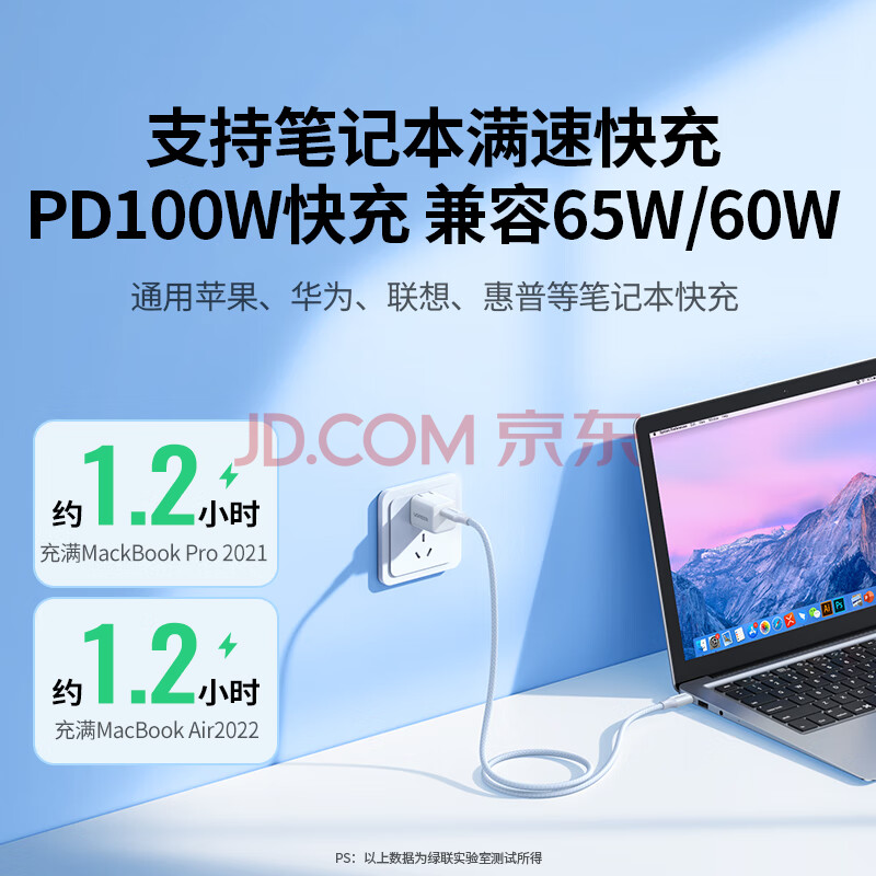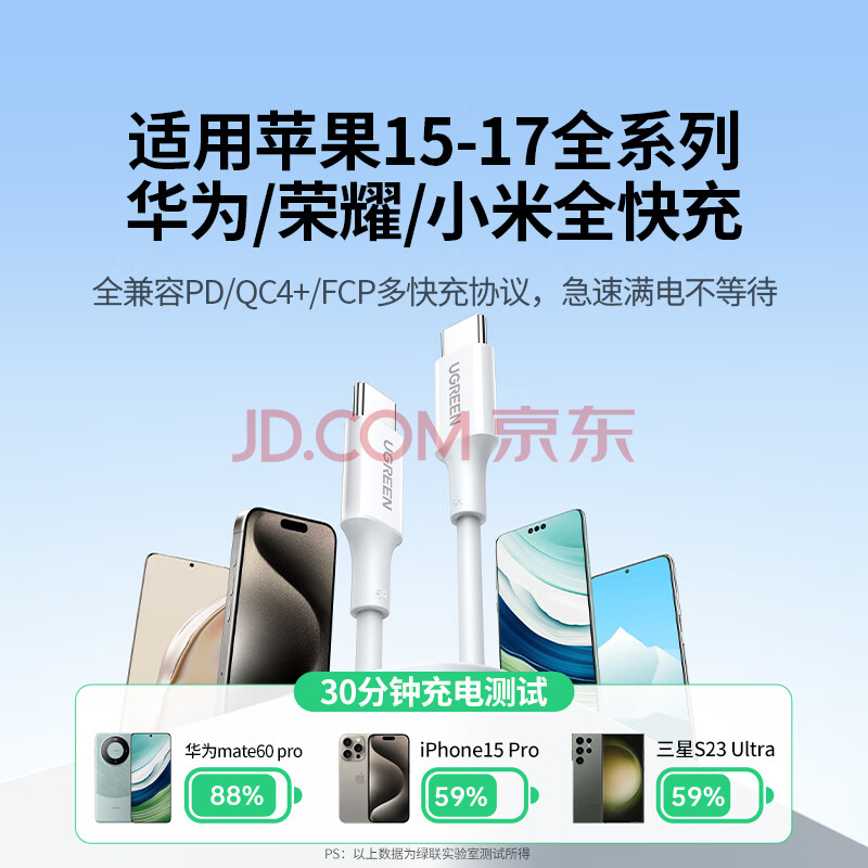商品相册:绿联双头Type-C数据线PD100W/88W超级快充ctoc适用华为荣耀小米苹果17/16e/15平板笔记本电脑车载1.5米第