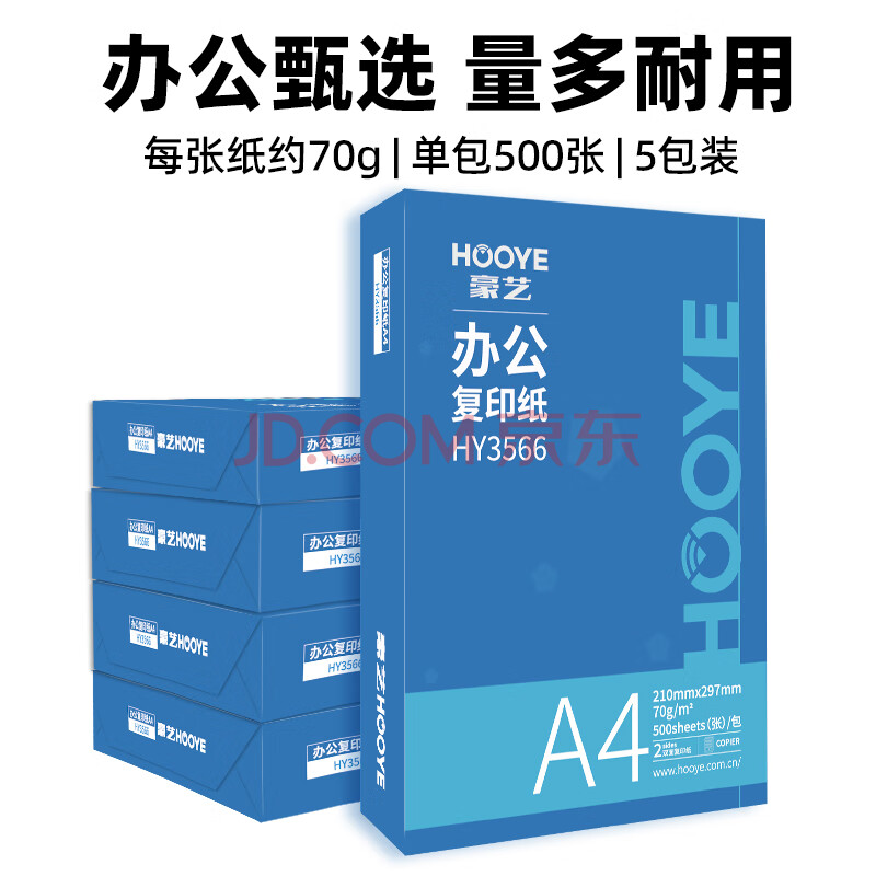 商品相册:豪艺(HOOYE)70g A4复印纸 高品质打印纸 双面草稿纸白纸HY3568 500张/包 5包第