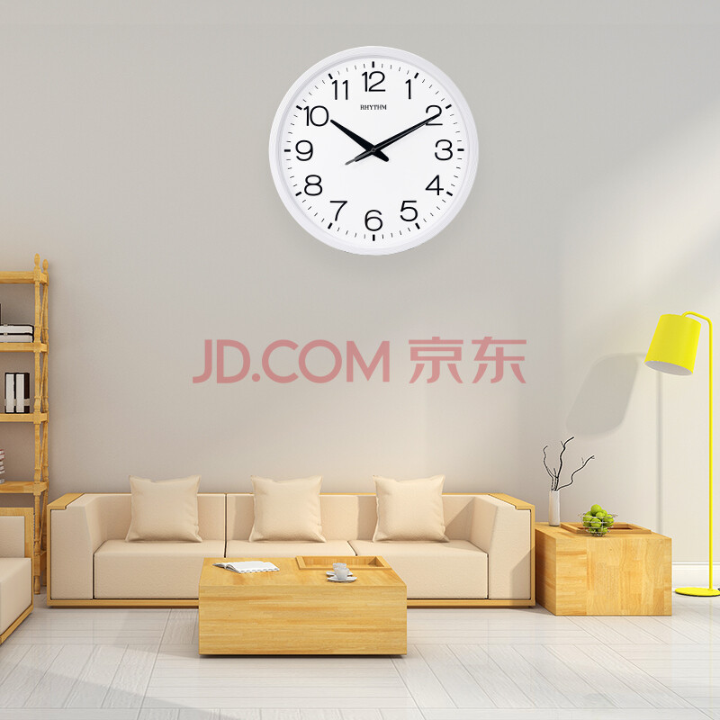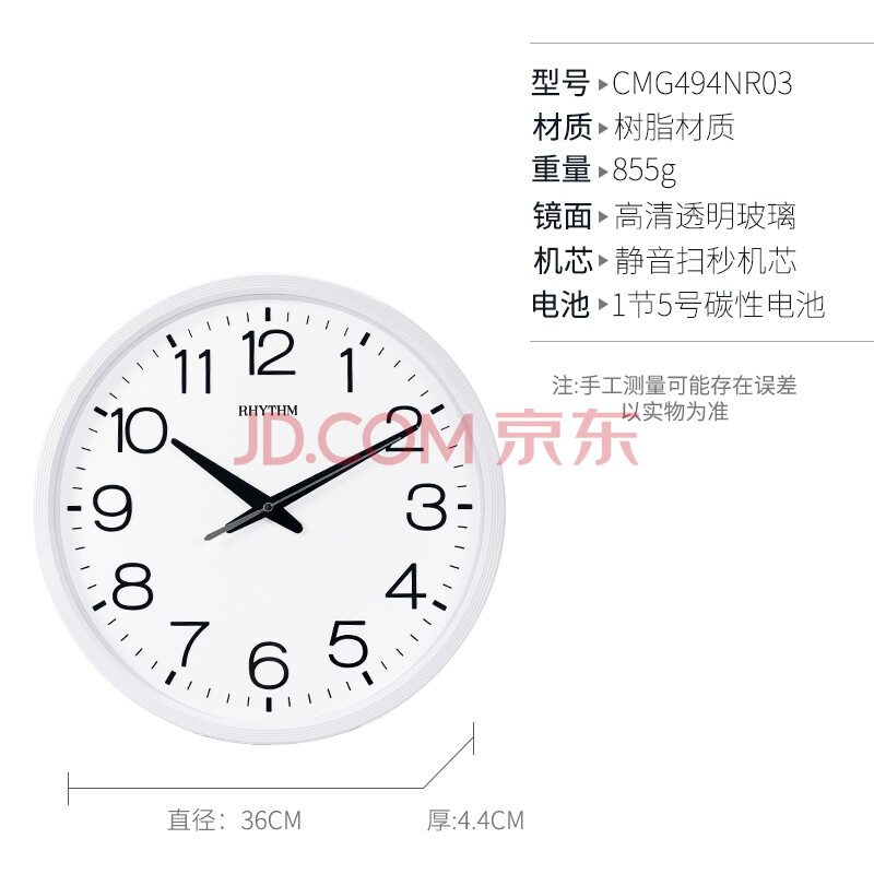 商品相册:丽声(RHYTHM)挂钟客厅卧室静音挂表现代简约创意时钟表挂墙36cm白色CMG494NR03第