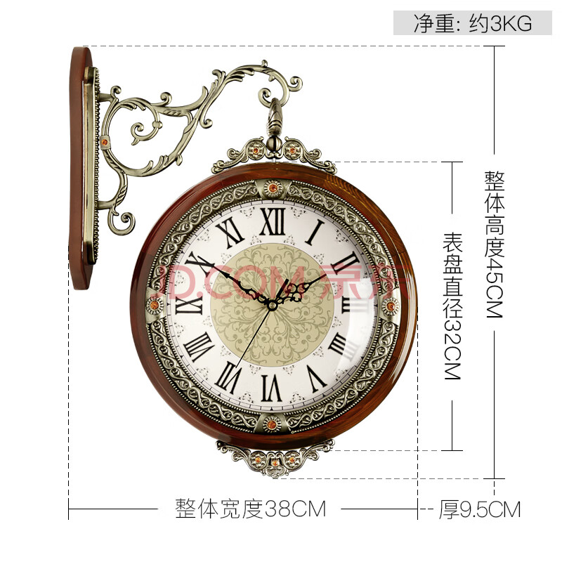 商品相册:汉时(Hense)客厅双面挂钟欧式挂表时尚创意石英钟表两面时钟HDS05棕色45cm第