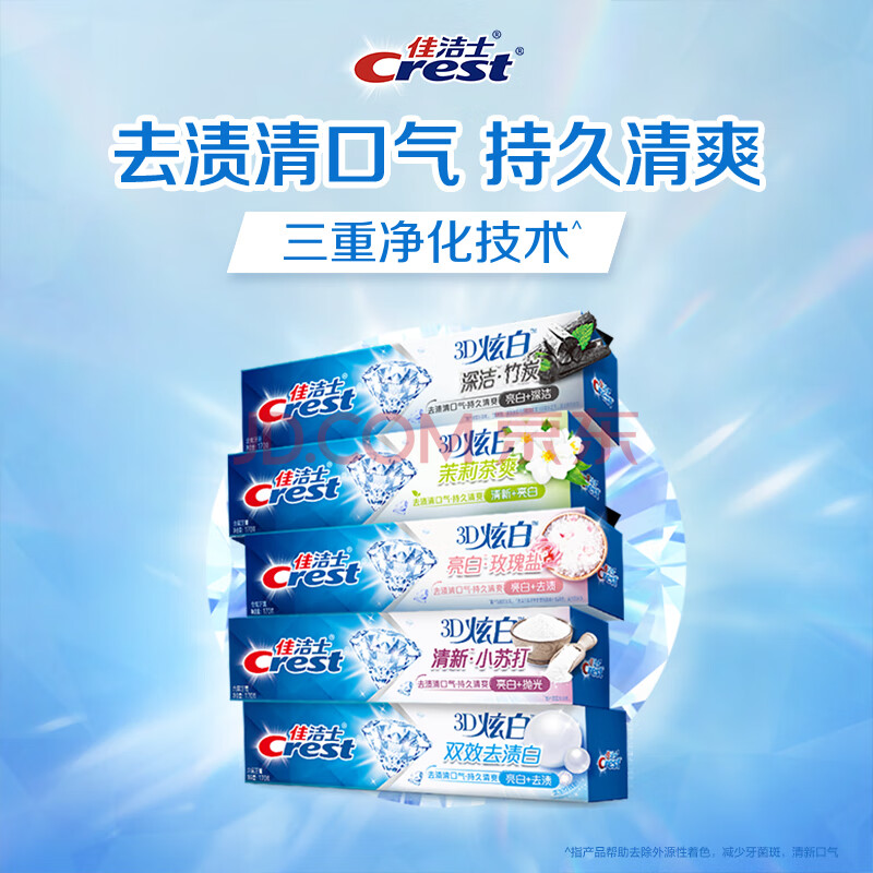 商品相册:佳洁士3D炫白小苏打牙美白膏防蛀清新口气5支共850g京东自营新老混发第