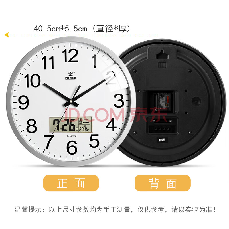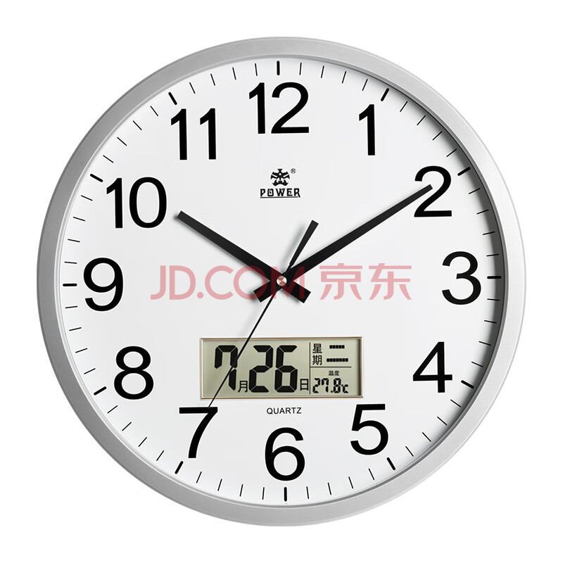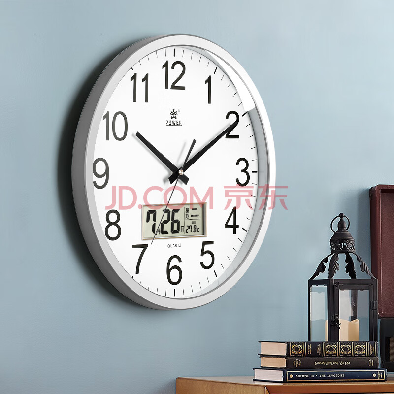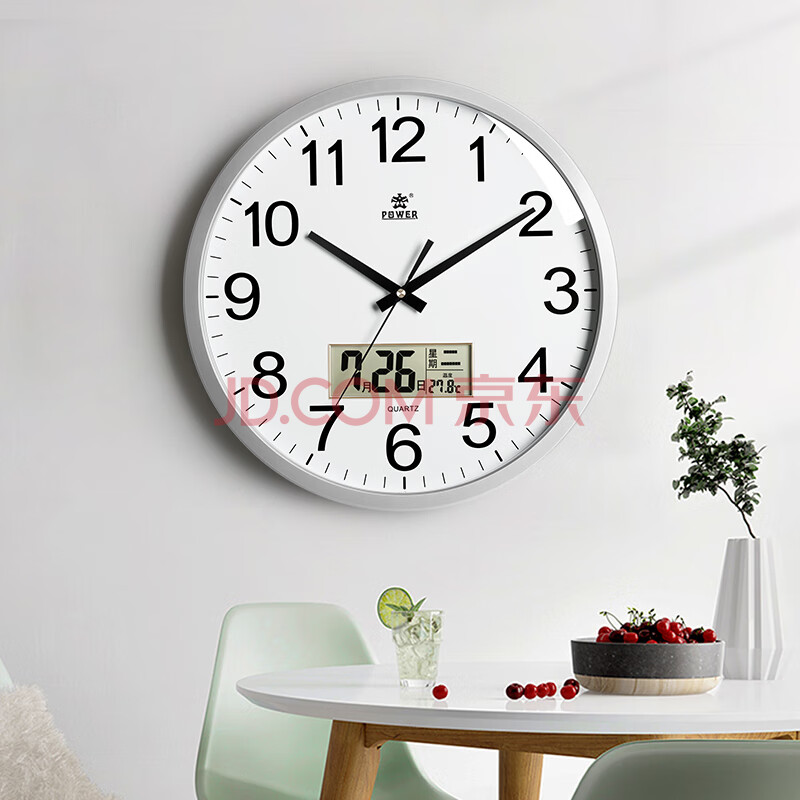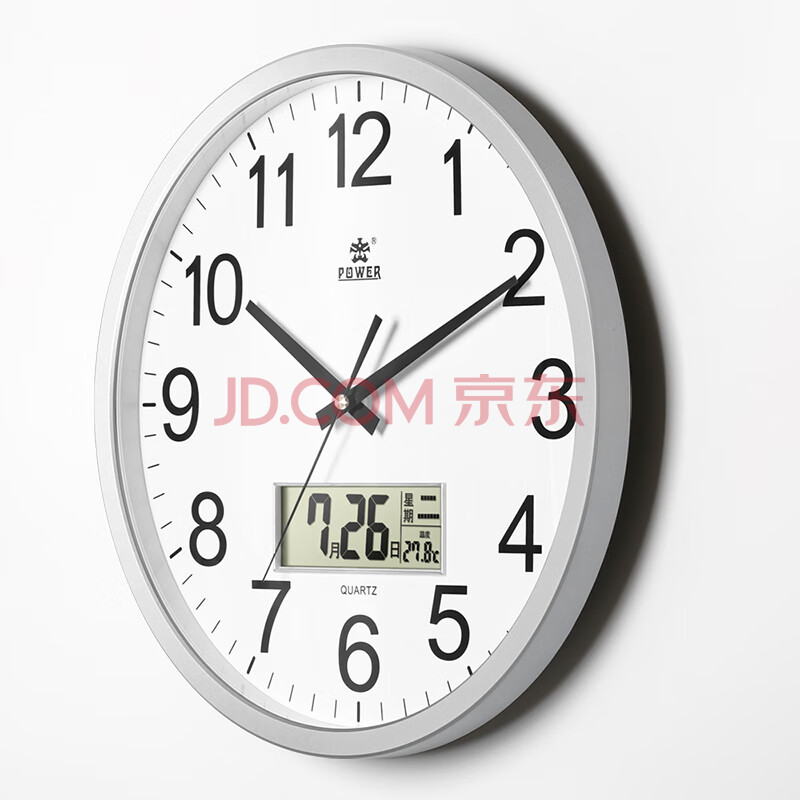 商品相册:POWER霸王挂钟客厅简约圆形时钟挂墙石英钟日历40cm银色BW24006F1第