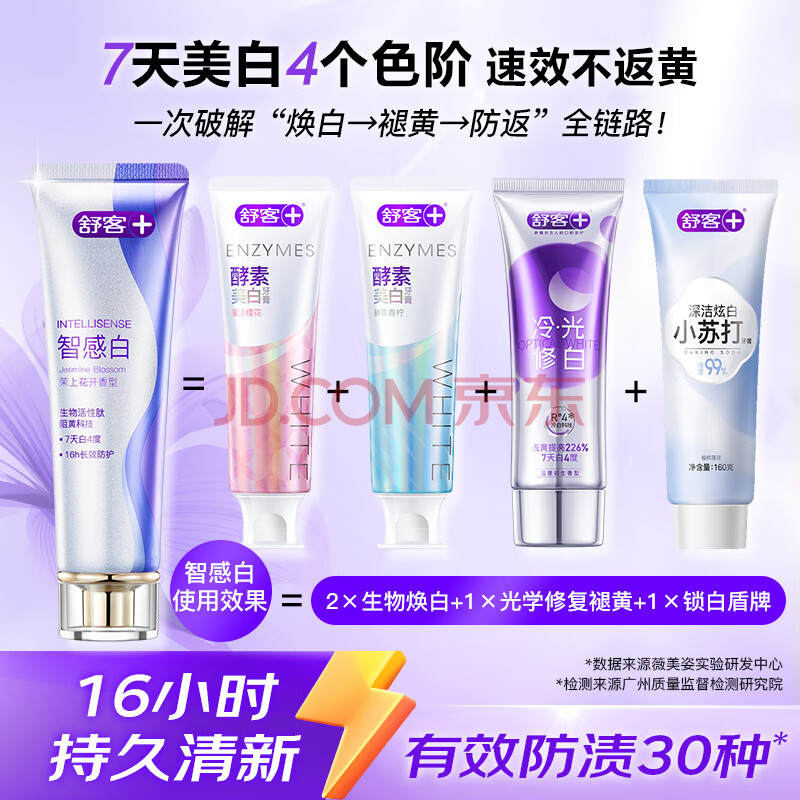商品相册:舒客美白牙膏京东自营去黄清新口气含氟护龈青少年成人茉莉味120g*2支第