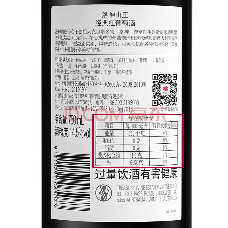 商品相册:洛神山庄澳洲奔富 经典干红葡萄酒 单支装 原瓶进口 正品行货一体标 木塞第