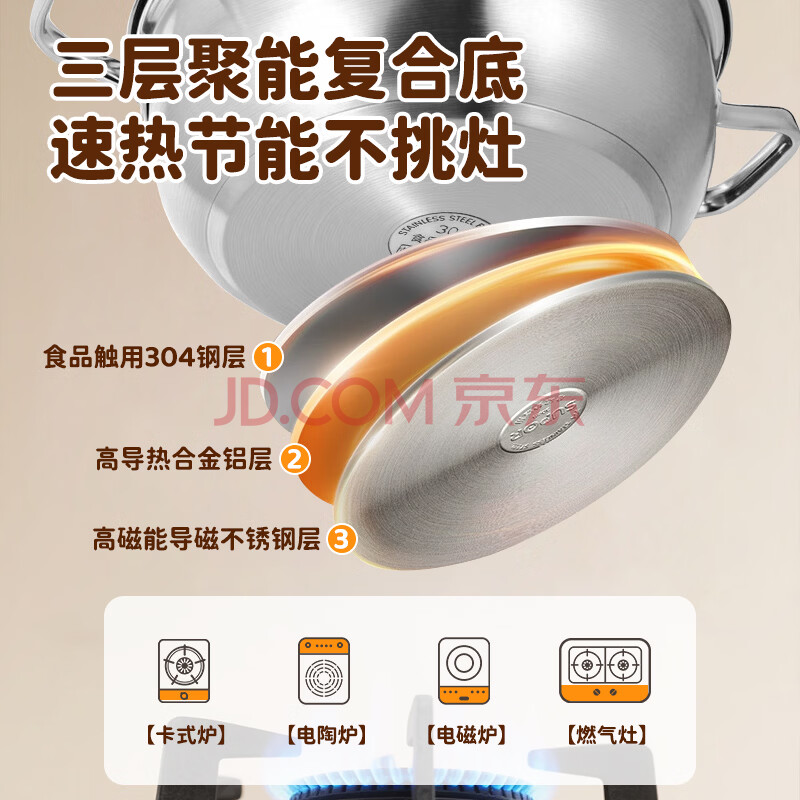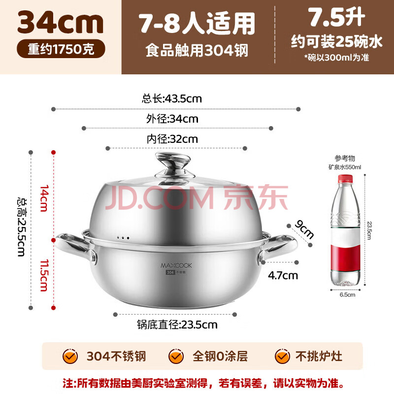 商品相册:美厨(MAXCOOK)蒸锅汤锅火锅 304不锈钢单层34cm 大口径加厚复底汤蒸锅第