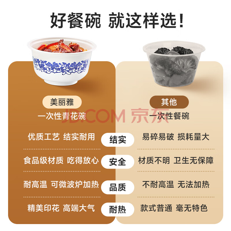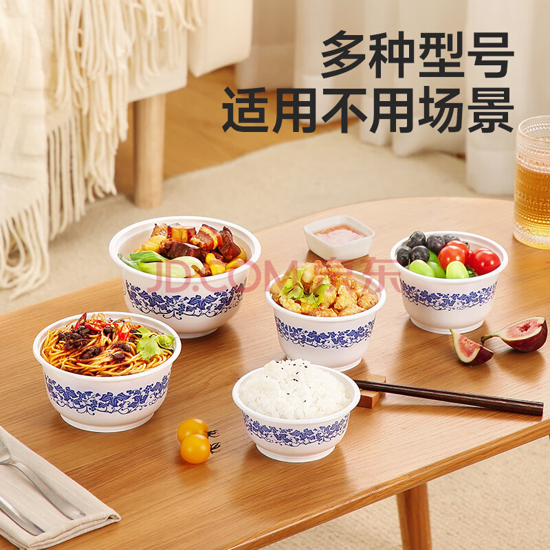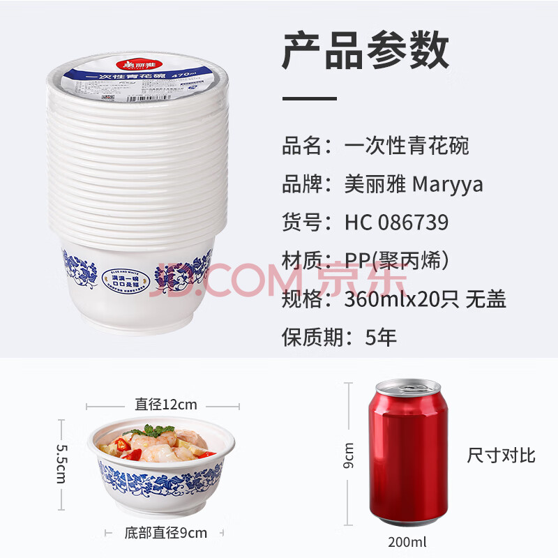 商品相册:美丽雅 一次性小碗360ml*20只 青花塑料餐盒食品级汤圆米饭冰粉碗不带盖第1张/共9