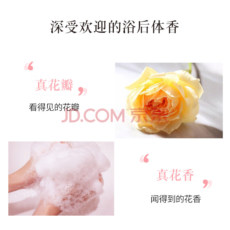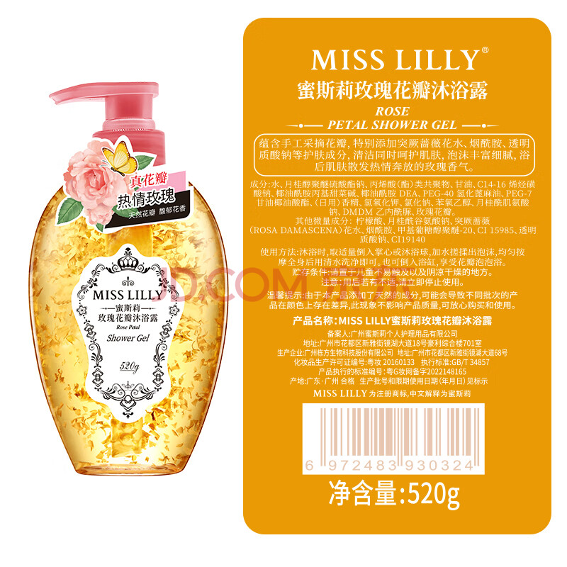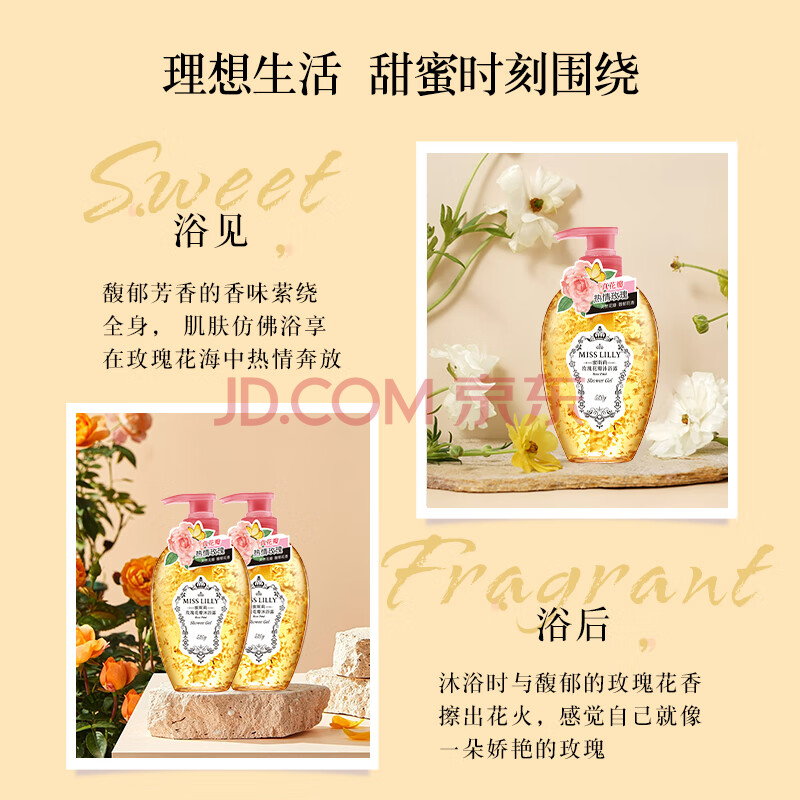 商品相册:Miss Lilly 蜜斯莉玫瑰香氛花瓣沐浴露520g 天然花瓣 无皂基 氨基酸沐浴乳第