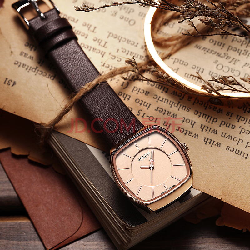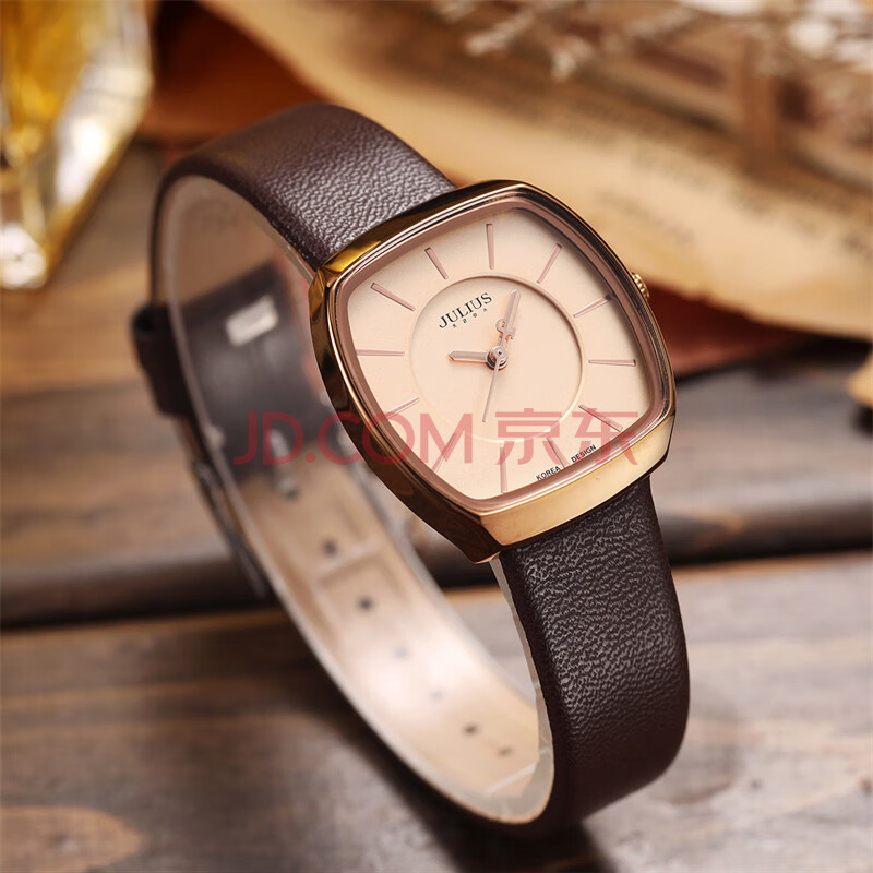 商品相册:聚利时(Julius)手表女复古时尚酒桶形简约皮带百搭石英学生女士手表棕色JA-669LD第
