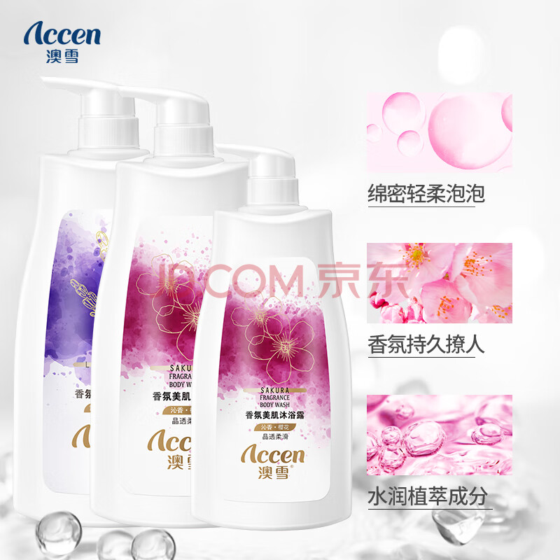 商品相册:澳雪(accen)浪漫香氛美肌沐浴露套装 900g薰衣草+900g樱花+500g樱花第