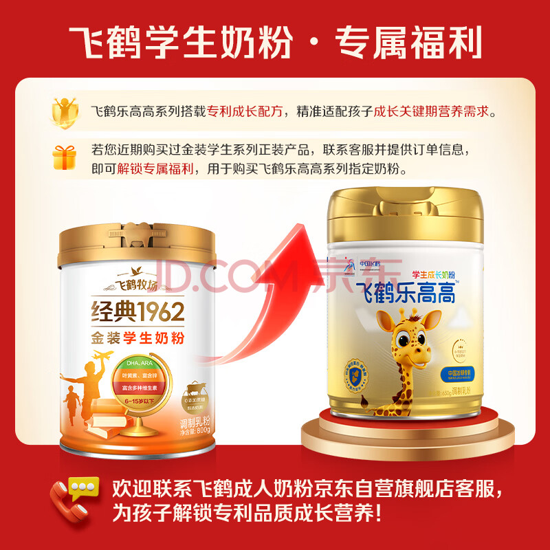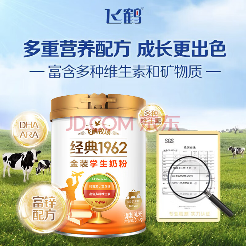 商品相册:飞鹤1962金装学生牛奶粉800g高锌高蛋白维生素青少年营养粉儿童第1张/共6