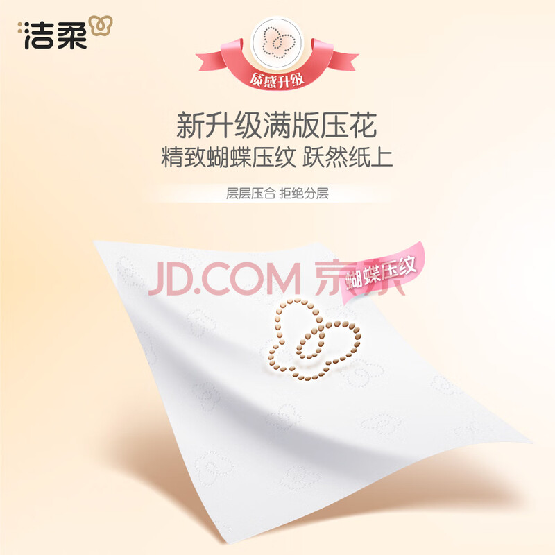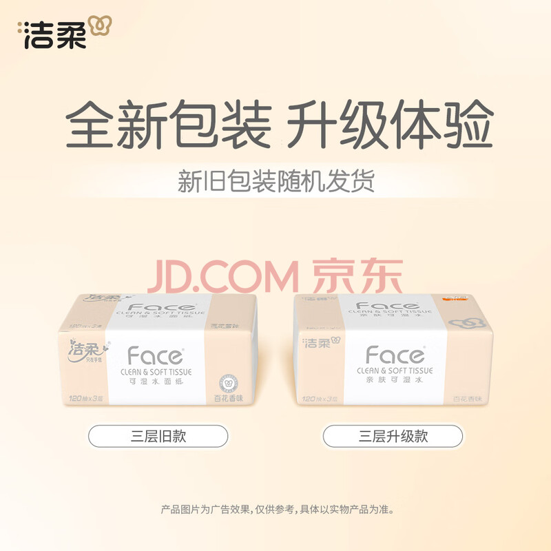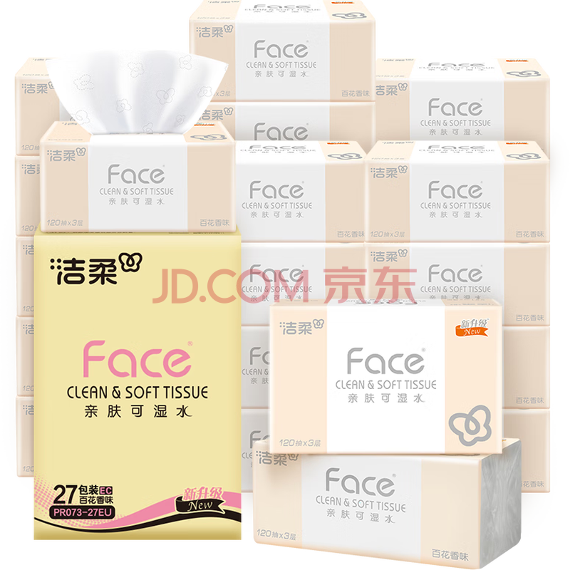 商品相册:洁柔抽纸 粉Face柔韧3层120抽*27包 面巾纸百花香可湿水原生木浆整箱第