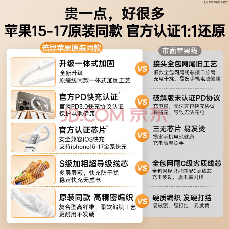 商品相册:倍思双头Type-C充电线PD100W/88W超级快充数据线适用苹果17/16/15华为荣耀小米手机iPad笔记本 1米白第