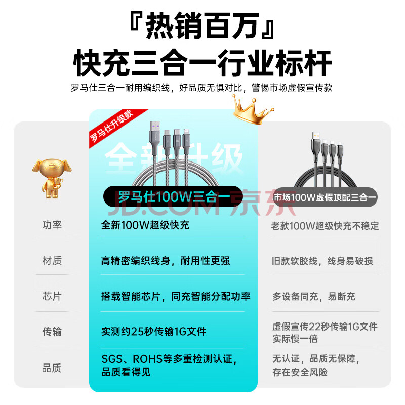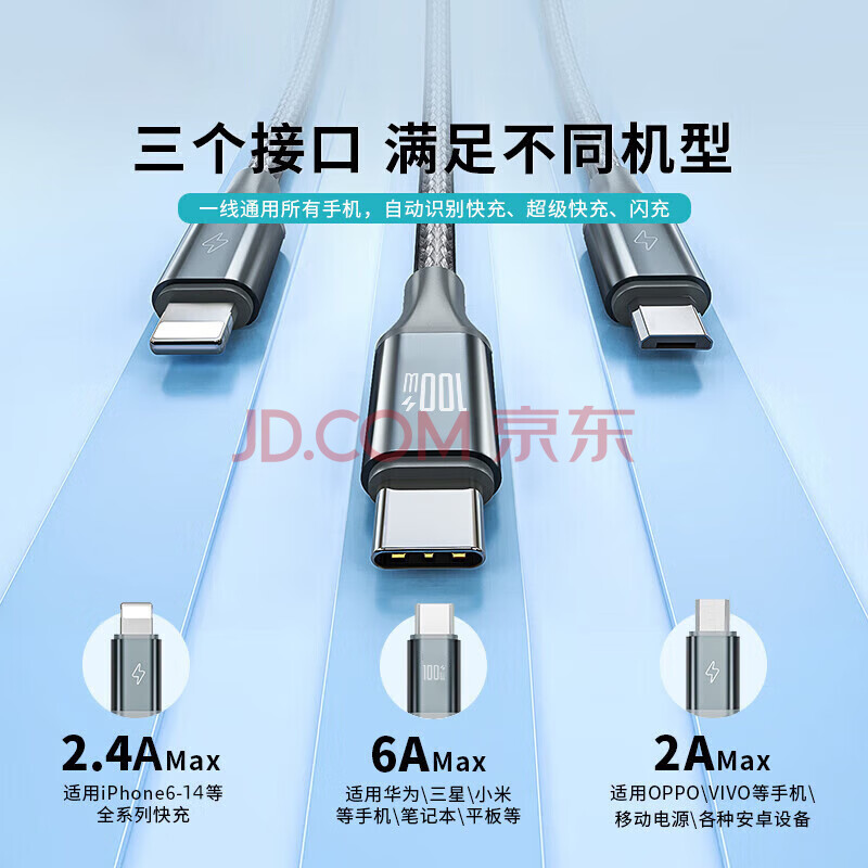 商品相册:罗马仕 数据线三合一充电线6A快充100W充电器线一拖三头适用苹果Type-c安卓iPhone16/15小米华为手机车载第
