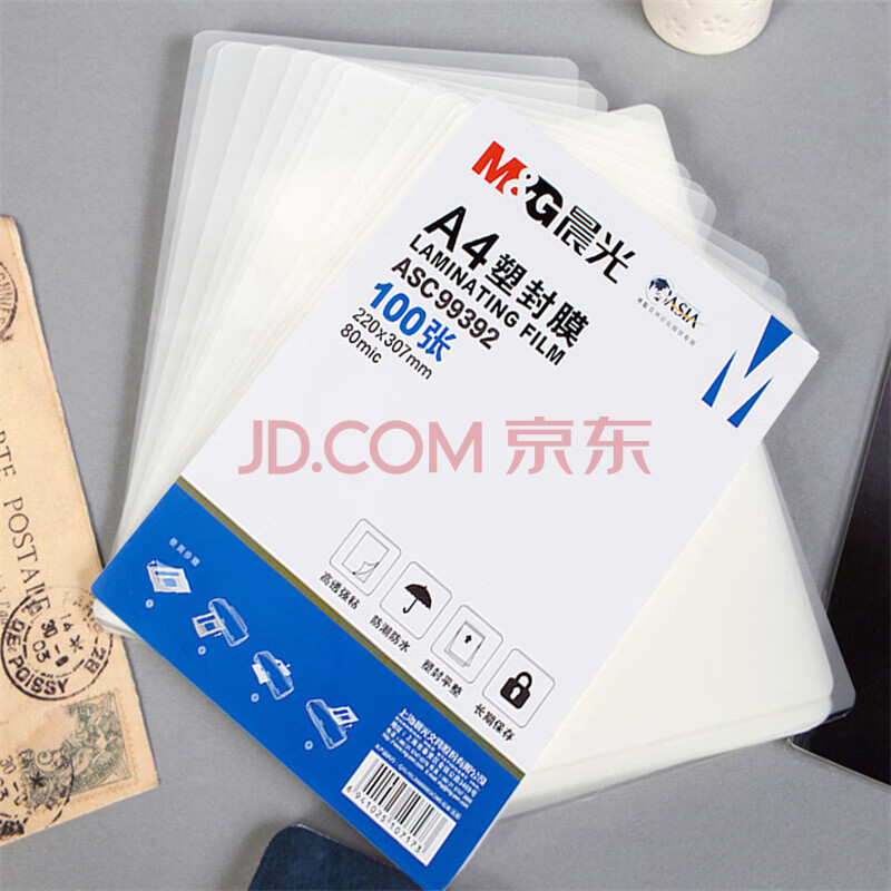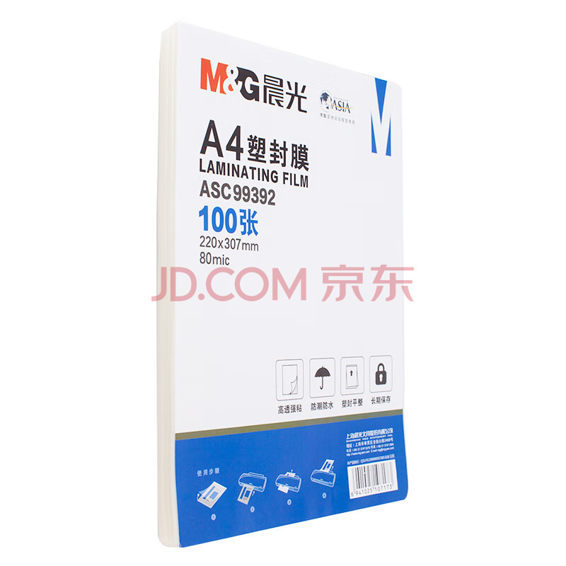 商品相册:M&G晨光文A4塑封膜 99392 80丝加厚透明高清覆膜机过塑膜 护卡照片企业执照文件资料 照片塑封膜纸ASC99392第