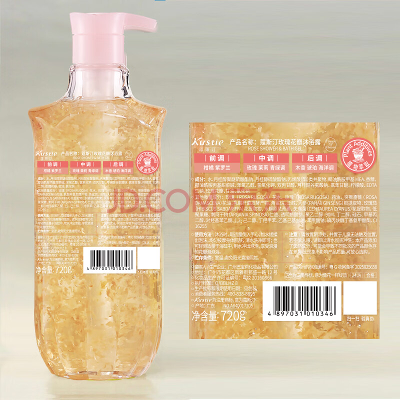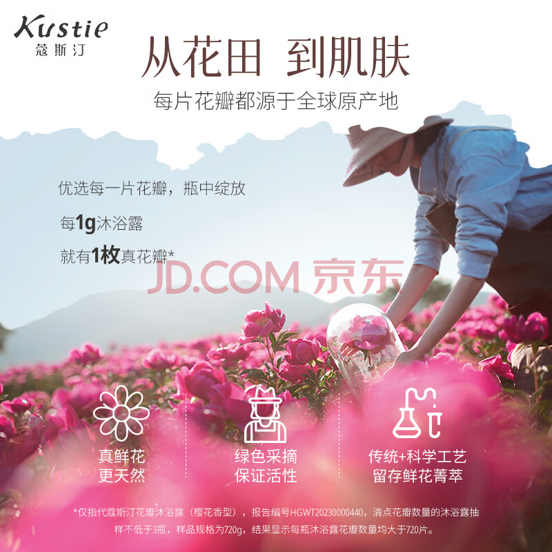 商品相册:蔻斯汀(Kustie)新升级玫瑰花瓣沐浴露720g 香氛沐浴泡沫丰富第