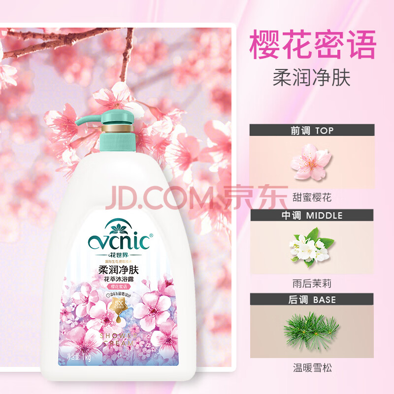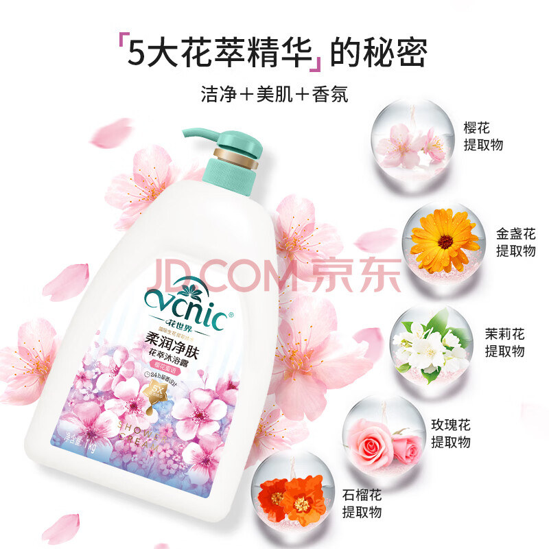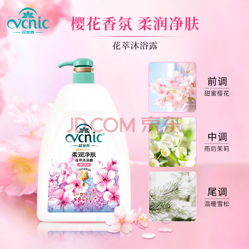 商品相册:花世界(VCNIC)柔润净肤花香沐浴露1kg 温和保湿 男女通用大瓶持久留香第