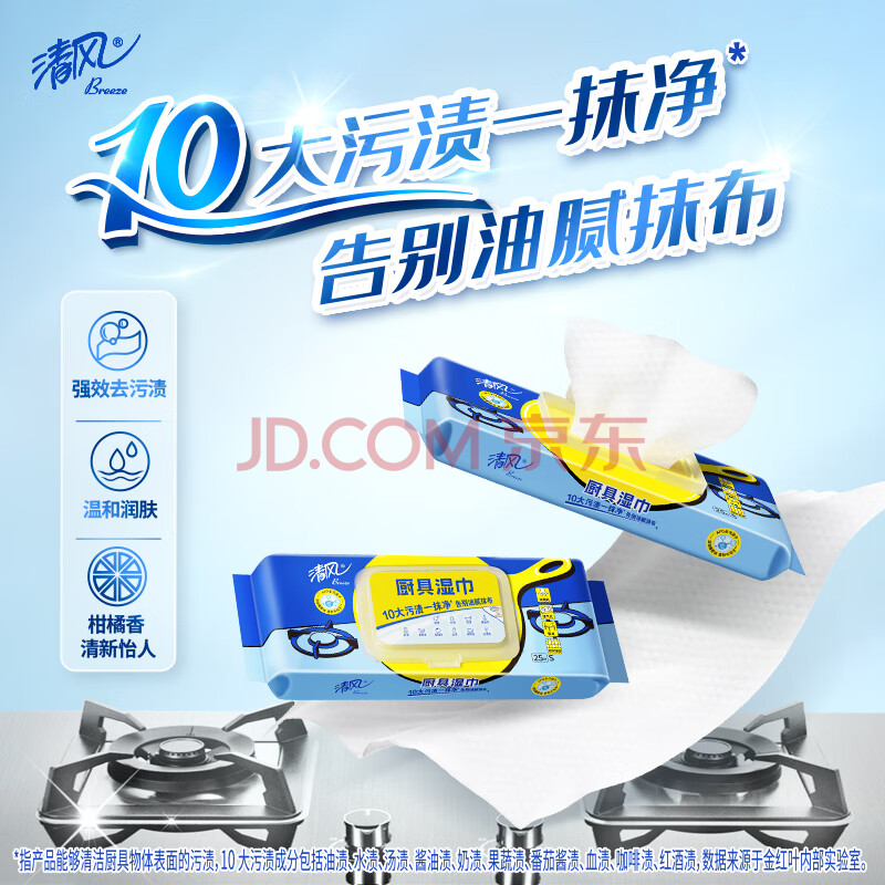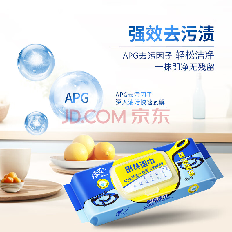 商品相册:清风厨房厨具湿巾25片*4包加大加厚强效去油污擦吸油烟机纸巾免洗涤剂第