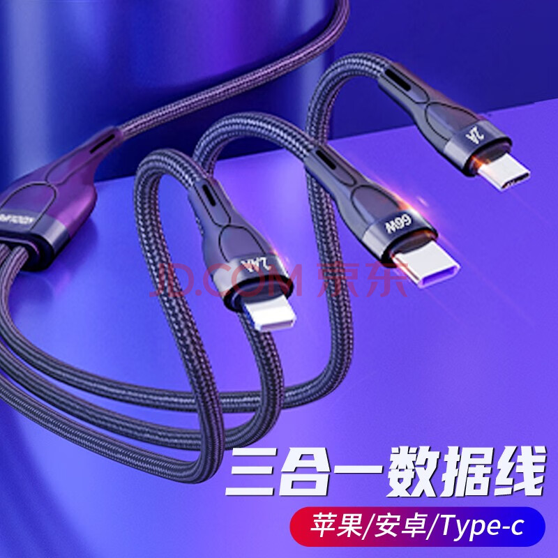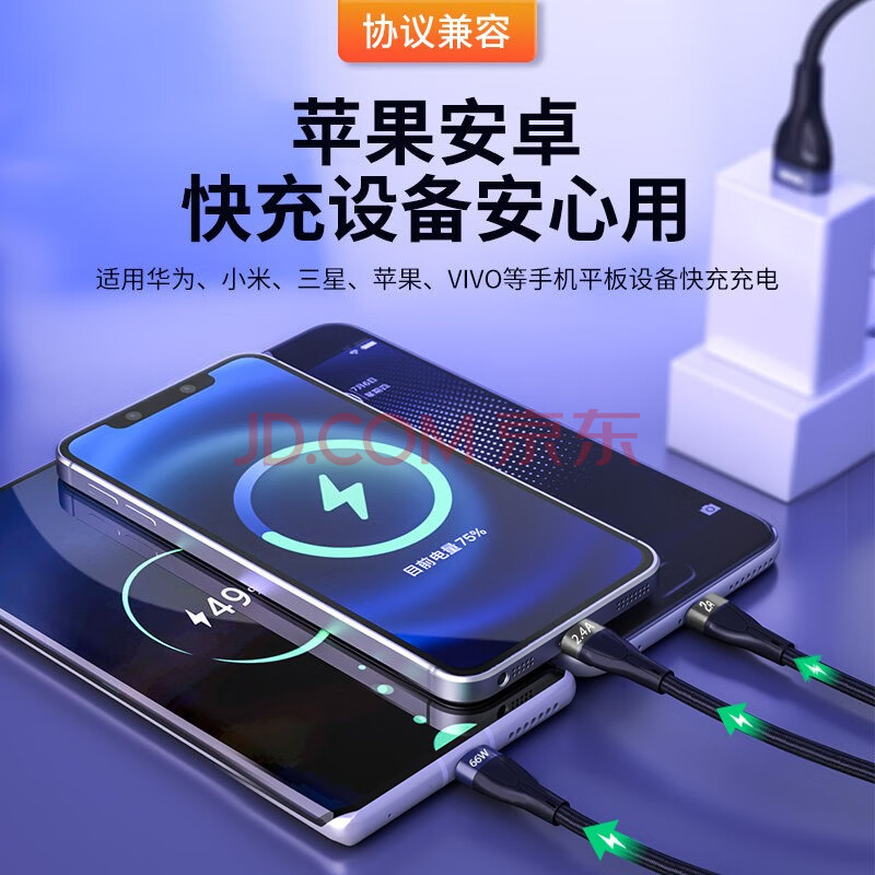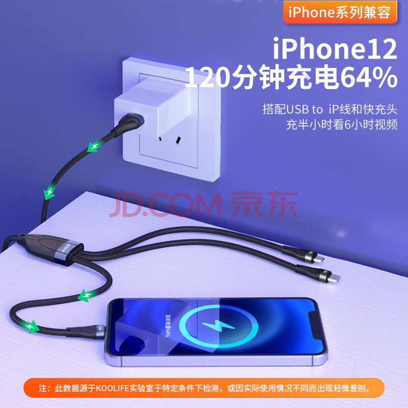 商品相册:KOOLIFE数据线三合一充电线快充线66w手机一拖三用多功能充电器车载usb/type-c适用苹果华为安卓平板ipad第