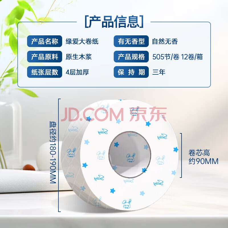 商品相册:缘爱大卷纸商用4层505节*12卷卫生纸大盘纸有芯卷筒纸厕纸巾整箱销售第